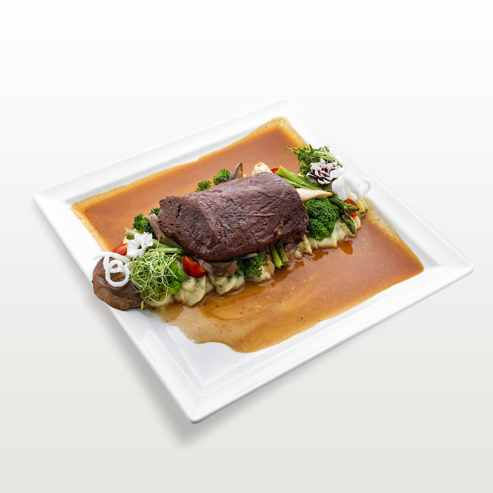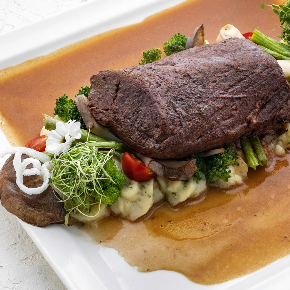 350 grams of veal fillet, mashed potatoes, blanched vegetables, demi-glace sauce