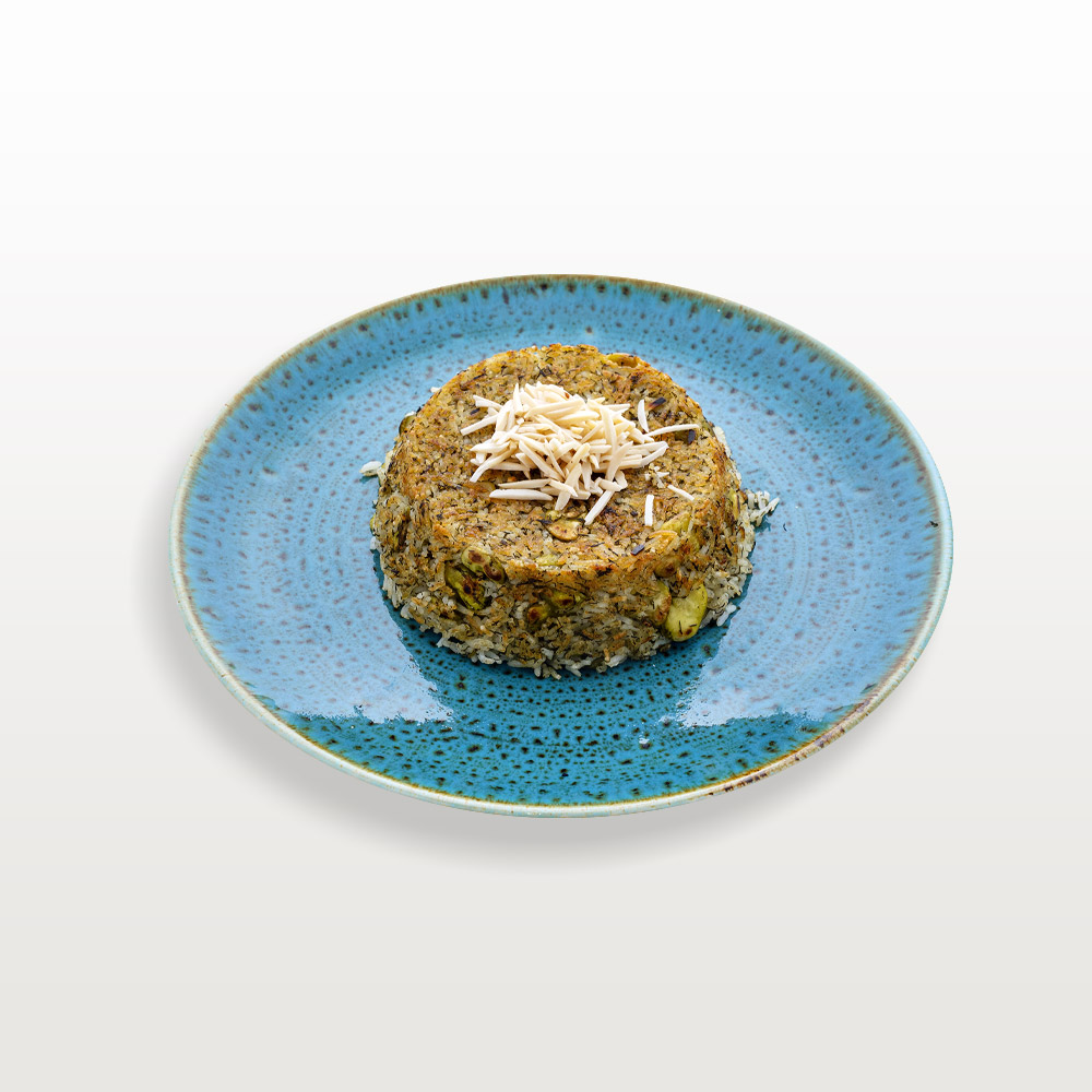 650g slow-cooked lamb shank with butter, onion, garlic, and saffron, served with dill rice and garnish