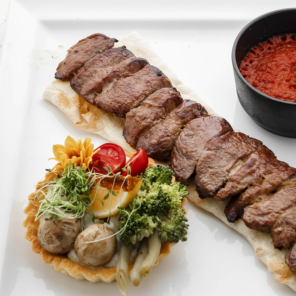 300 grams of sliced and seasoned lamb shank with coriander, sumac sauce and grilled tomatoes
