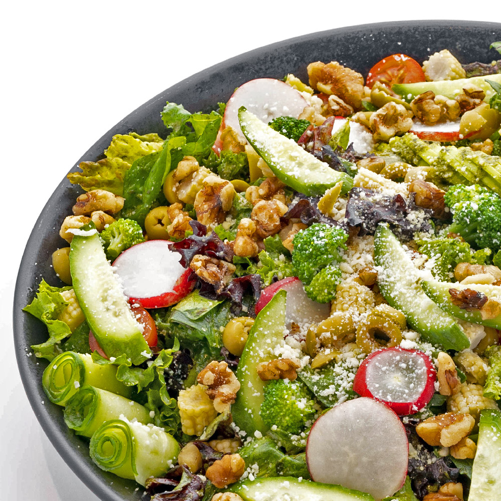 کاهو فرانسه، کلم بروکلی، زیتون، رکولا، کیل، گردو، گوجه گیلاسی، خیار، تربچه، سیب سبز،درسینگ گرین، گلیز بالزامیک، بی بی کورن