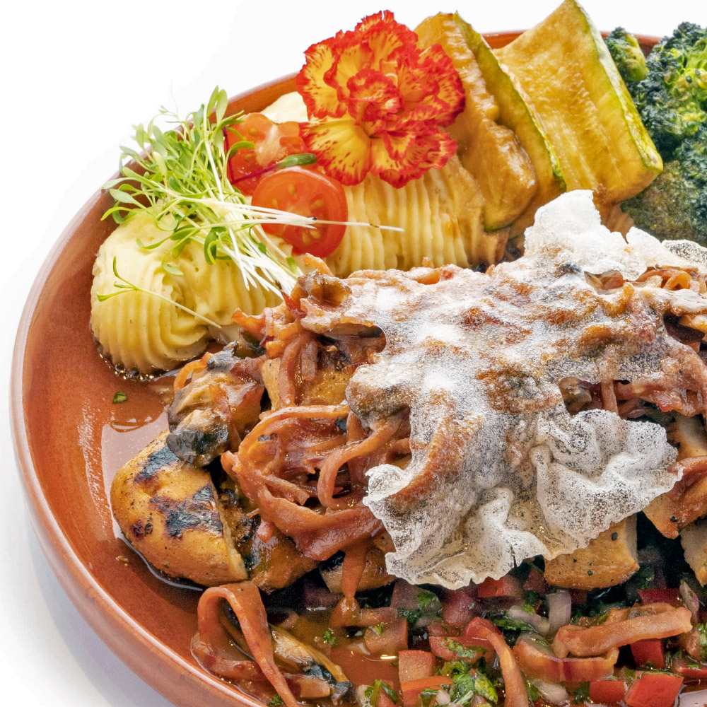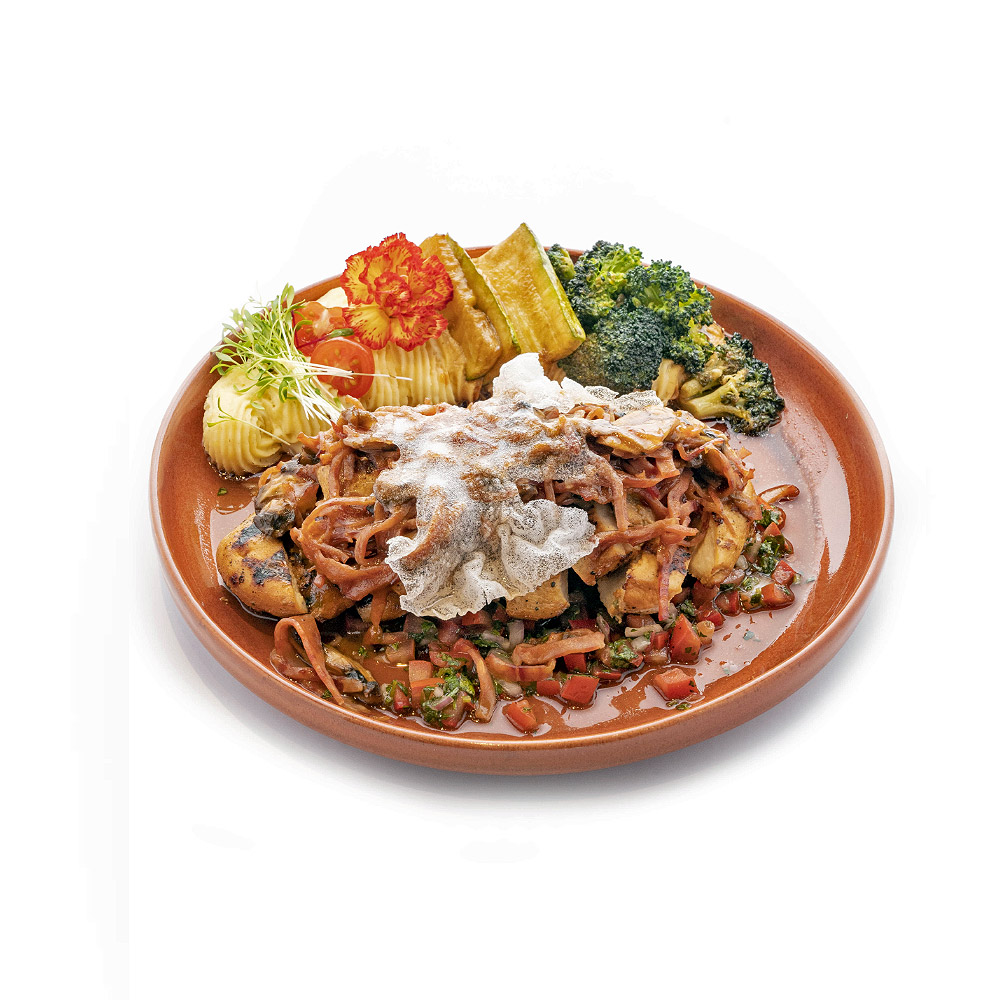 سینه مرغ فراوری شده در سس آسیایی به همراه قارچ و بیکن سرخ شده، پوره سیب زمینی و سس سالسا دودی