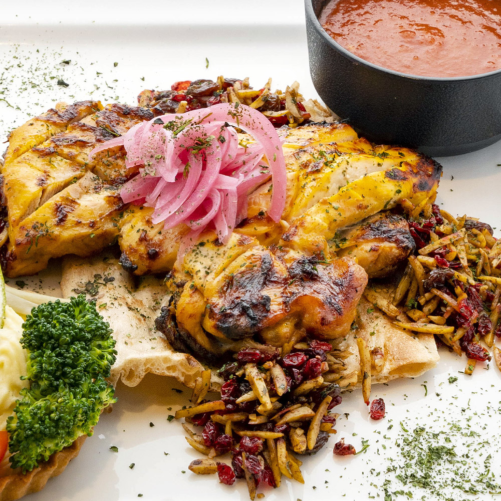 سینه مرغ طعم دار شده 350 گرمی به همراه دورچین و گوجه کبابی
